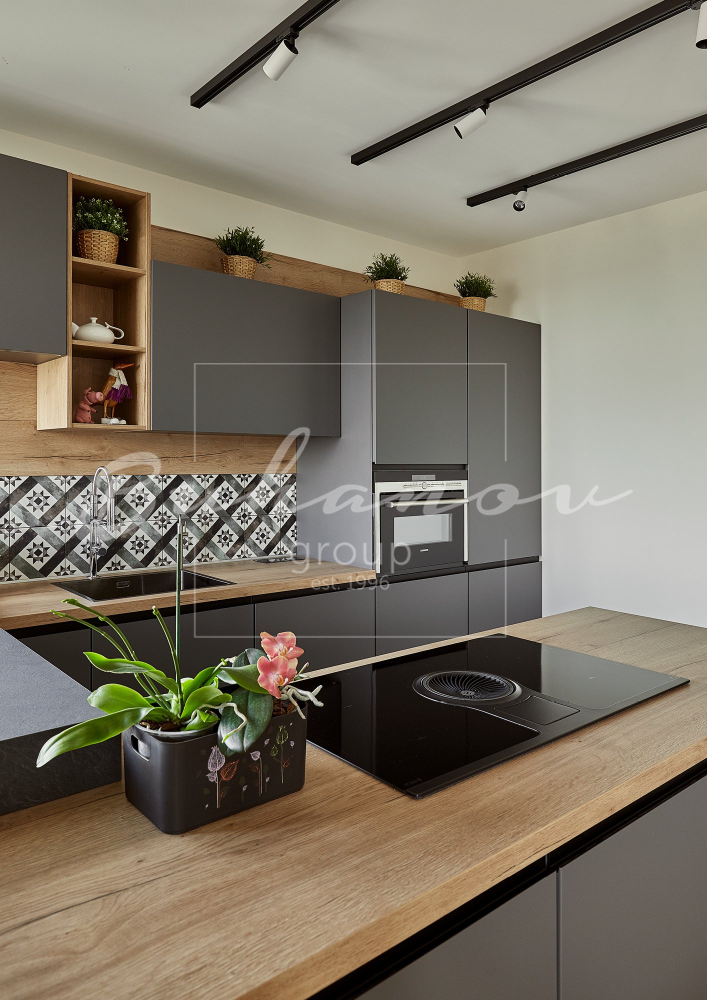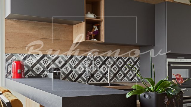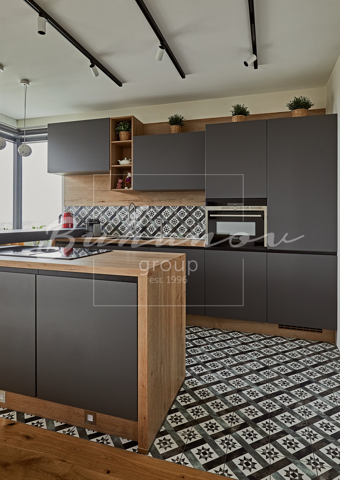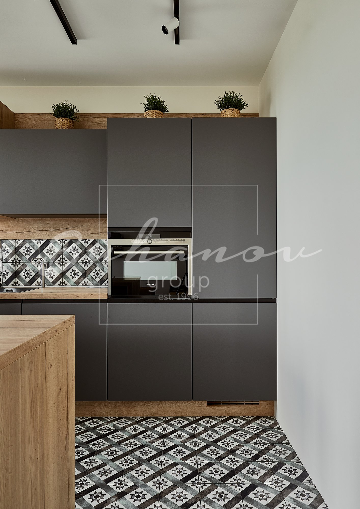 Матовые фасады выполнены в суперматовом бархатистом покрытии, устойчивом к отпечаткам пальцев, цвет «серый шифер».