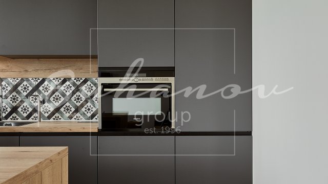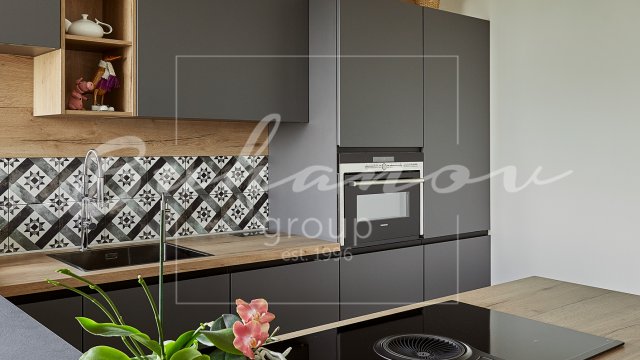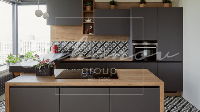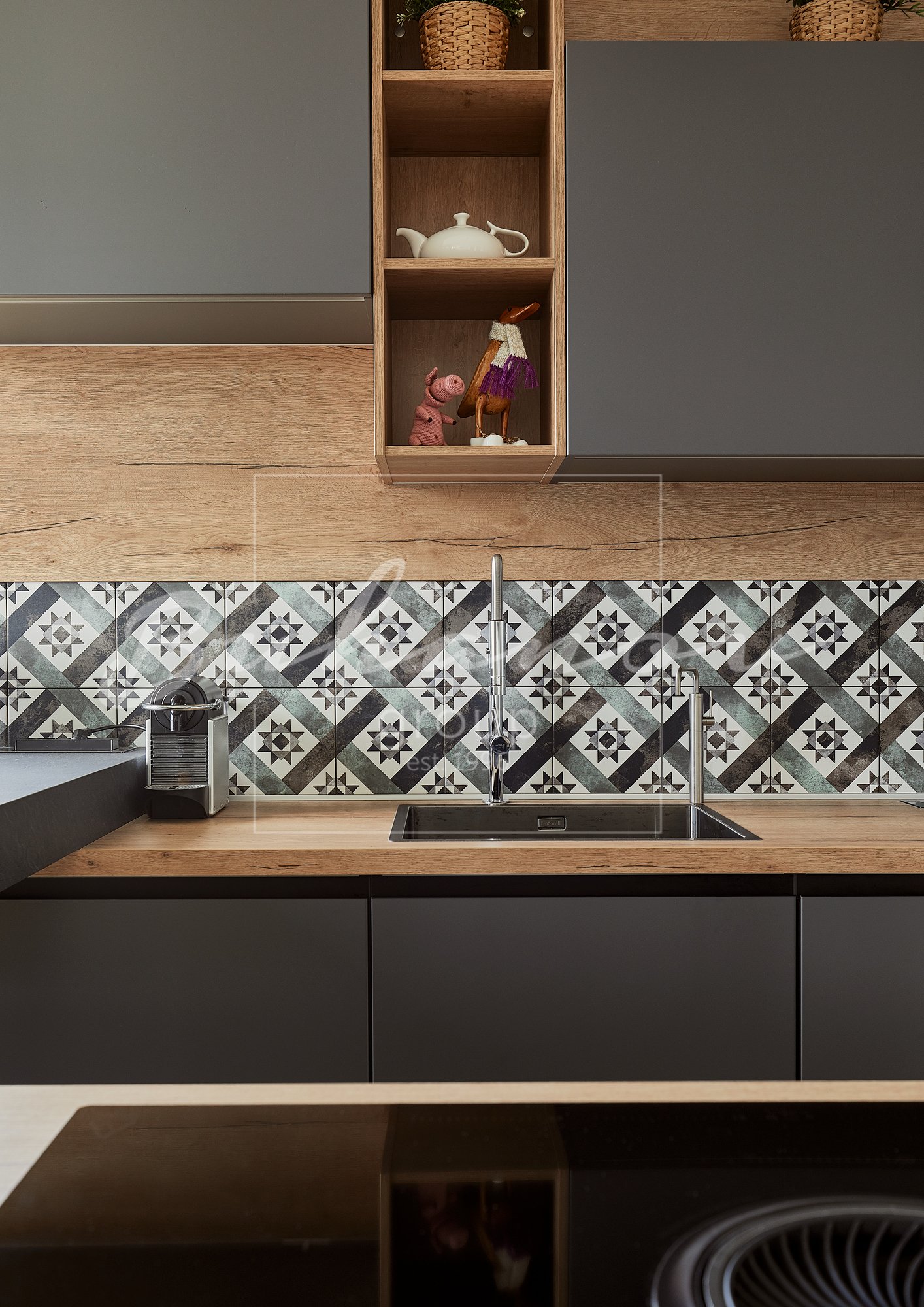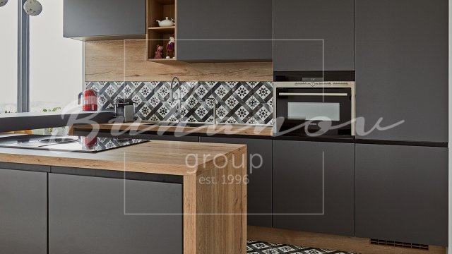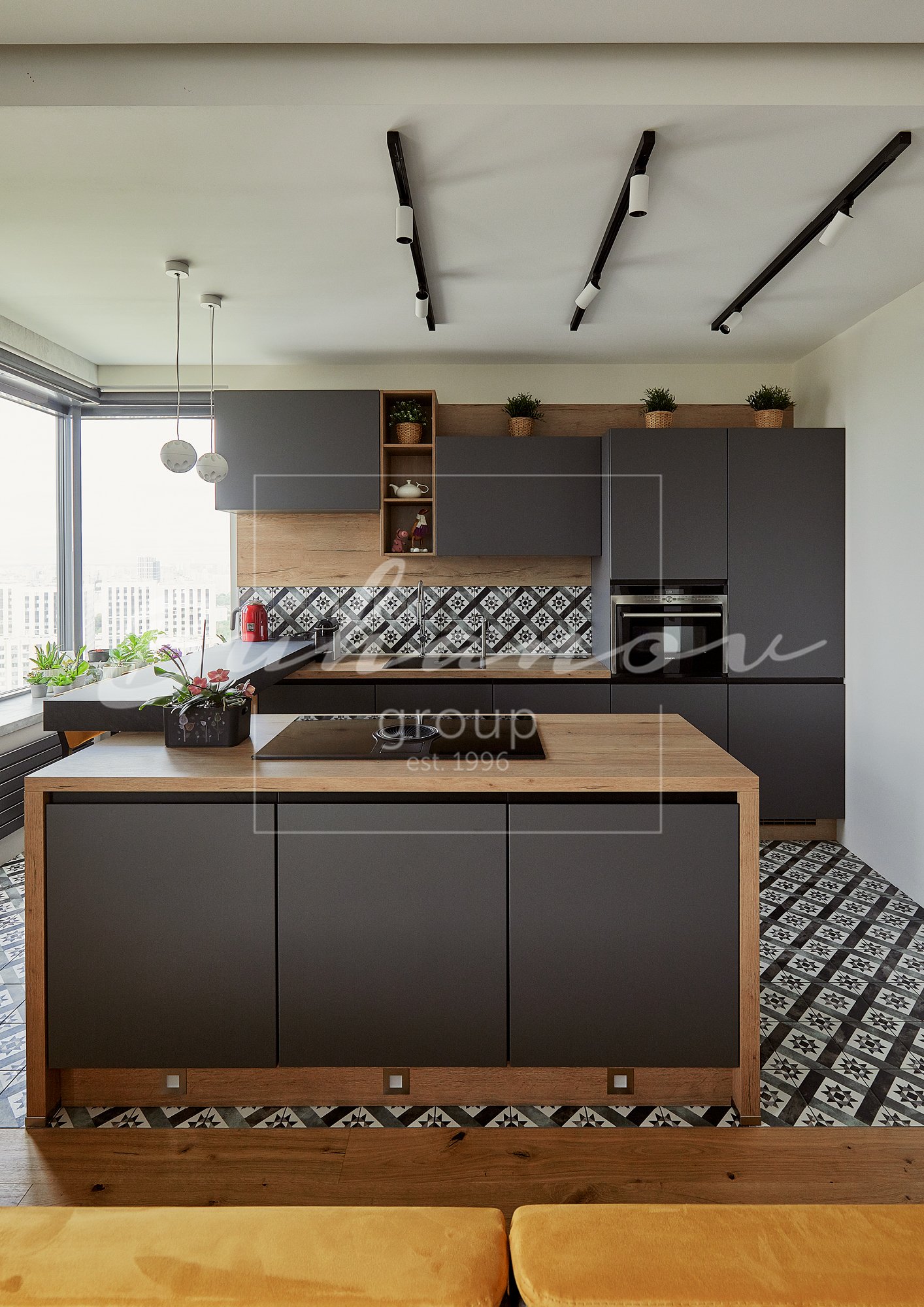 Матовые фасады выполнены в суперматовом бархатистом покрытии, устойчивом к отпечаткам пальцев, цвет «серый шифер».