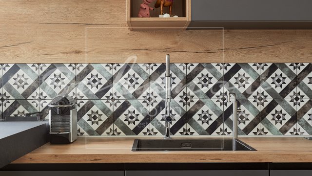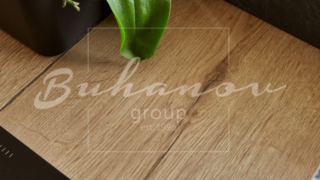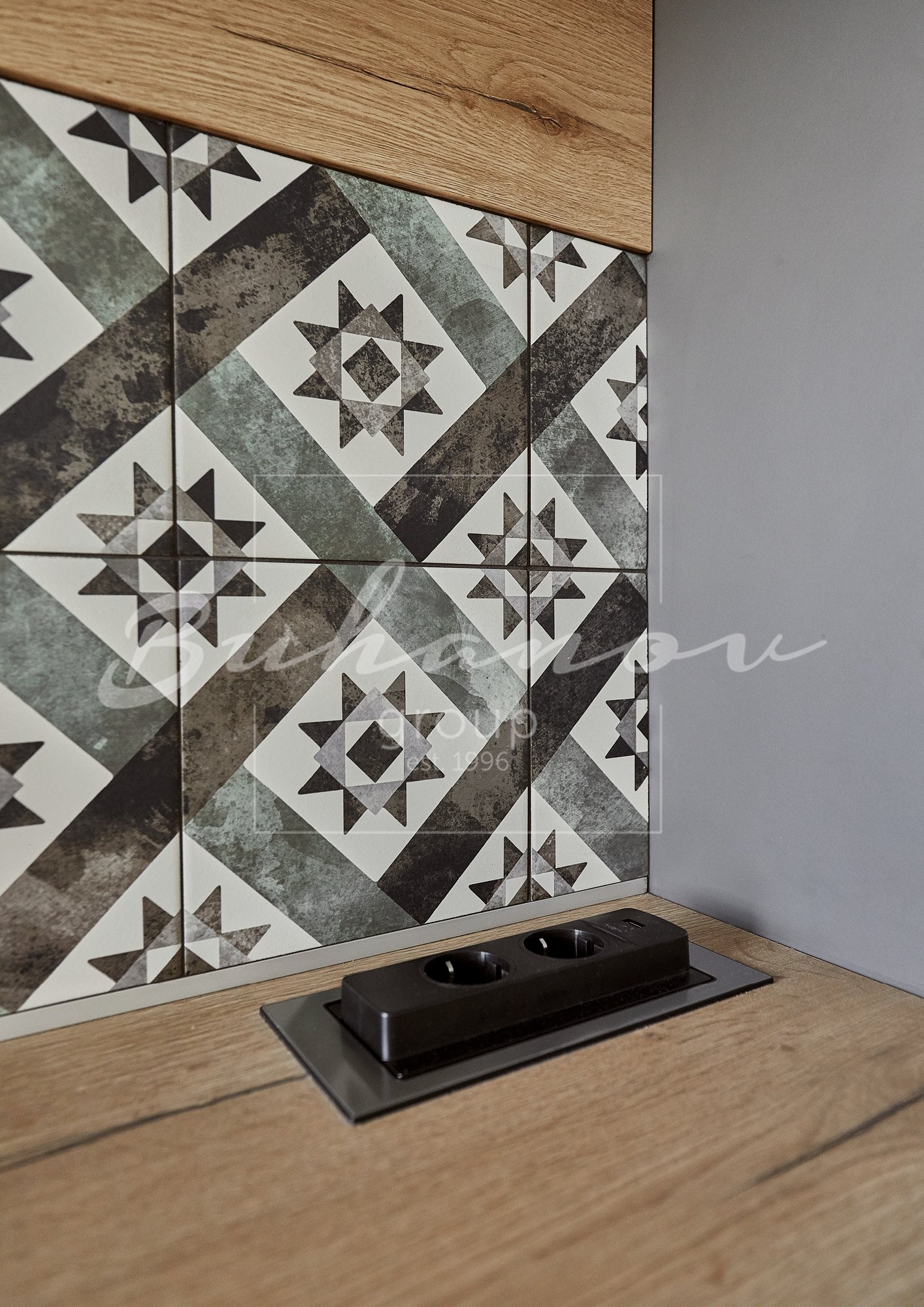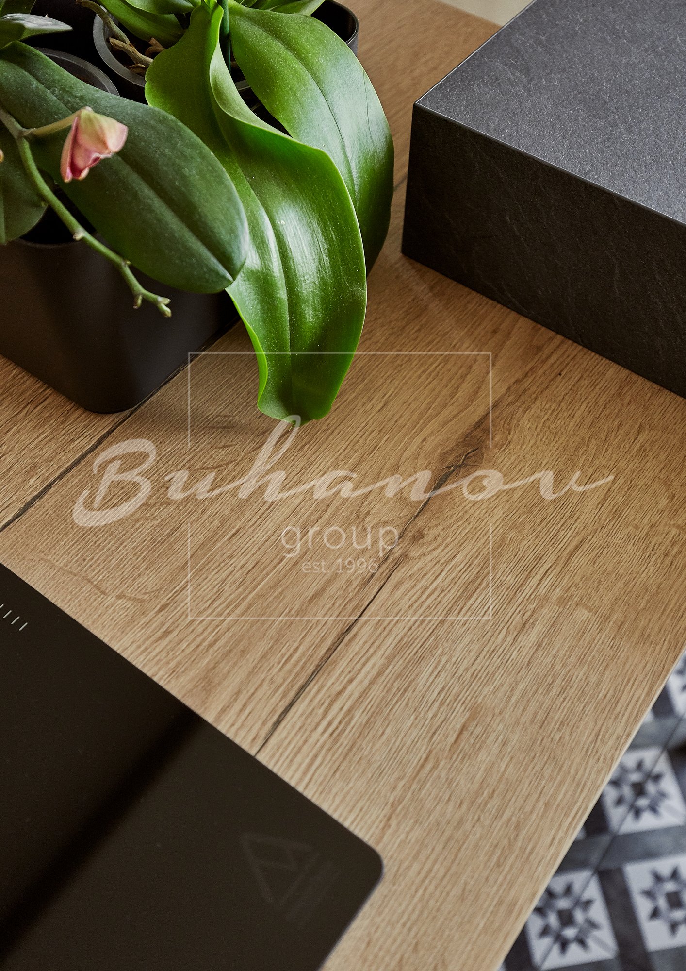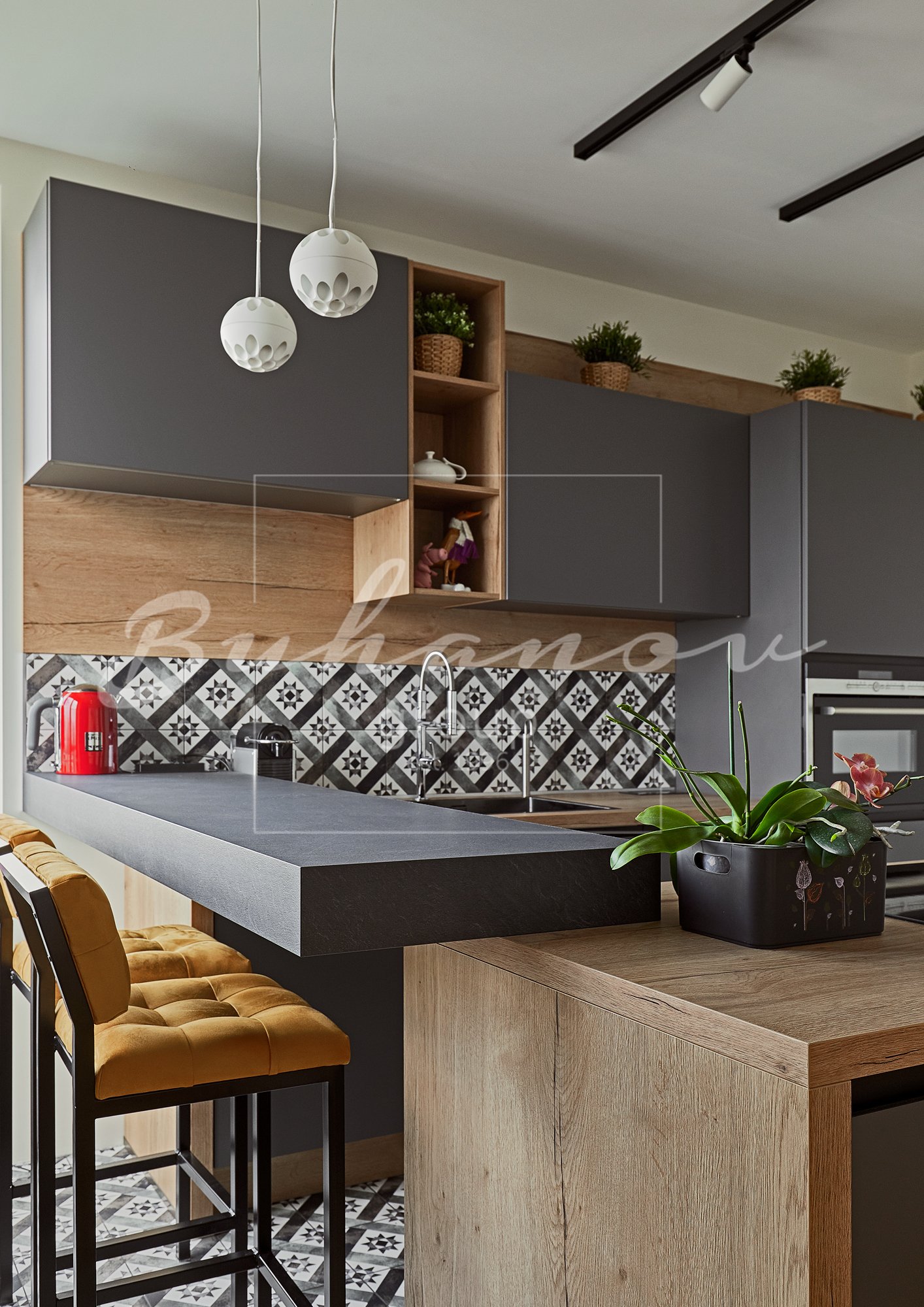 Открытые полки, а также столешницы выполнены из ламината с имитацией дерева в оттенке «eiche sierra», барная накладка толщиной 10 см.представлена в цвете «серый шифер».